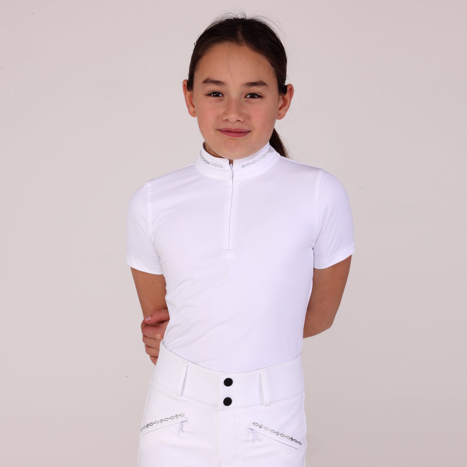 Aubrion Optima is created for elite competition performance using modern design technology, innovative fabrics, and championship ready styling. Optima young rider show shirts offer advanced mobility and technical support through all levels of competition and all disciplines. The cut allows a contour fit; the elegant high collar and short sleeves present a neat finish. Cool stretch fabric feels soft and comfortable; moisture management and quick dry technologies give fresh feel athletic efficiency.