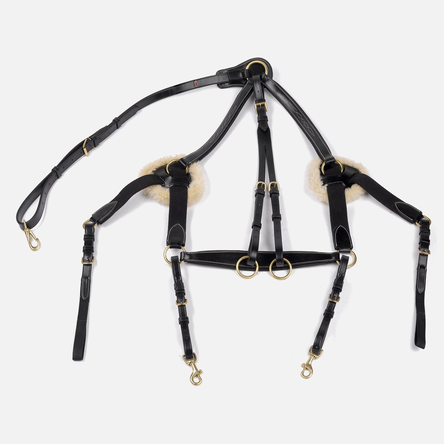 Made from high quality European leather, thick durable elastic, five-point connection to evenly distribute pressure, genuine, soft sheepskin shoulder pads, brass hardware and contrast stitch design. A running martingale attachment is included.