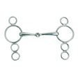 La joue du bâillon hollandais articulé comprend une série d'anneaux en acier, l'anneau de filet principal avec un anneau plus petit au-dessus et deux en dessous, permettant un certain nombre de positions différentes pour les rênes.